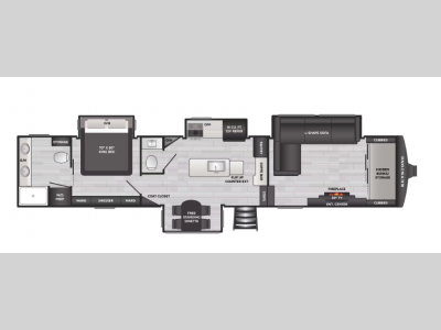 The Sprinter fifth wheels by Keystone feature spacious living areas, plenty of storage, and outstanding towability. Each unit is constructed with 2" thick double welded aluminum frame construction, a fully walkable roof and slide out roof, and dual layer insulation to help extend your camping season. The heated pass-through storage includes lockable slam latch baggage doors so you can easily pack your gear, and the one-touch 4-point leveling system features return hookup memory to have you set up in no-time. Head inside to find DynaSpan Marine Grade floor decking, Thomas Payne luxury collection furniture and residential style seamless marbled countertops to name a few comforts. The Sprinter also includes a Suburban tankless on-demand water heater, black out aluminum wheels, plus a 30k BTU furnace to ensure your comfort!